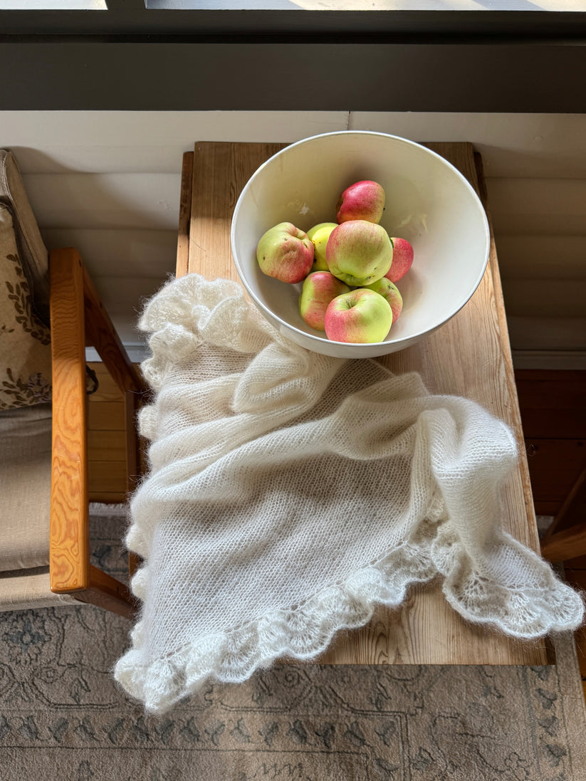 Betty Scarf is worked flat in stockinette stitch with steady side increases, growing into a triangle. When the shawl reaches the desired length, bind off, then pick up stitches along the edges and work a softly undulating wave ruffle to frame the piece. In fine silk mohair, Betty Scarf is light, airy and elegant - a timeless layer and a beautiful gift.