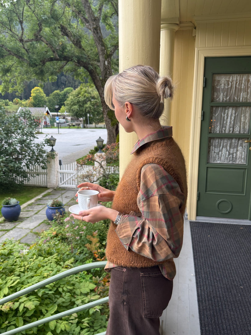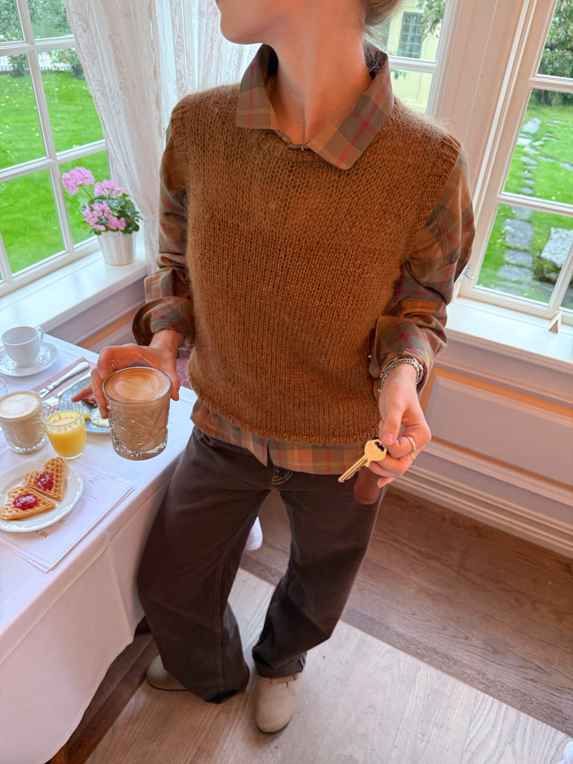 Elle Tee is knitted from the bottom up. The body is worked in the round in the base color until you reach the armholes. Then the work is divided, and the back and front yoke are knitted flat, back and forth, on 8 mm needles using a contrast color of two strands thin mohair. This creates a slightly translucent section while simultaneously decreases will be worked to shape the armholes. The shoulders are grafted together, and finally the neckline and sleeve ribbing are knitted in the base color.