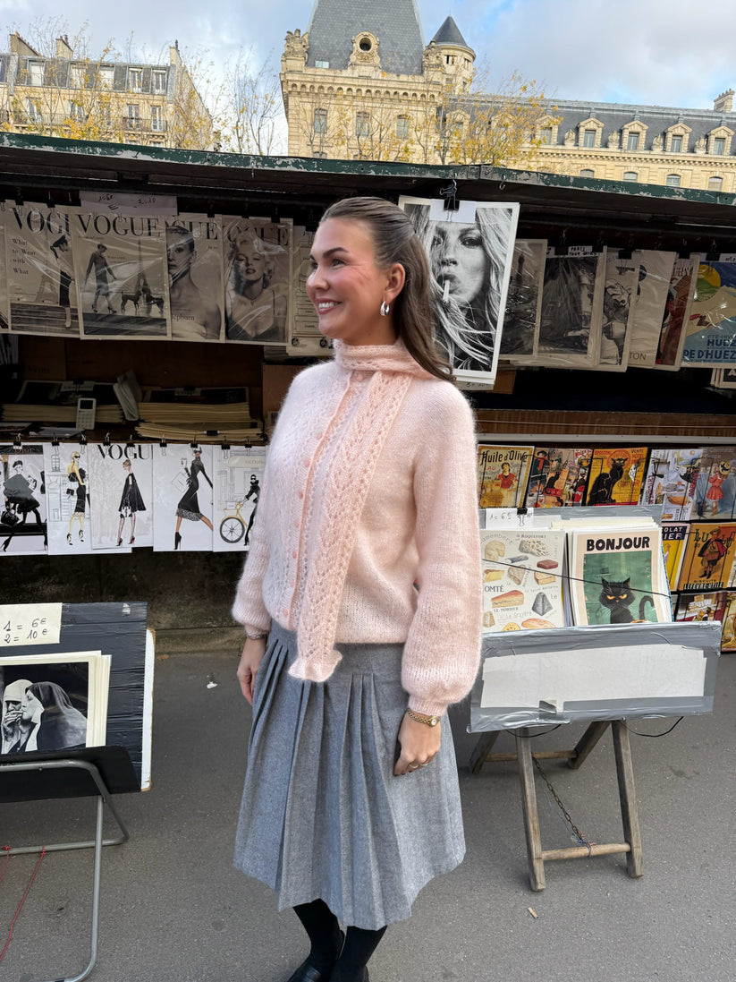 The Jolie Scarf is worked back and forth in stockinette stitch, with a textured pattern that creates a beautiful and elegant look. The pattern is formed using simple techniques such as yarn overs and stitches knitted together, resulting in an airy and decorative effect. The shawl shown in the photos is knitted with three strands of thin mohair, giving a soft, light, and delicate piece with a timeless feel.