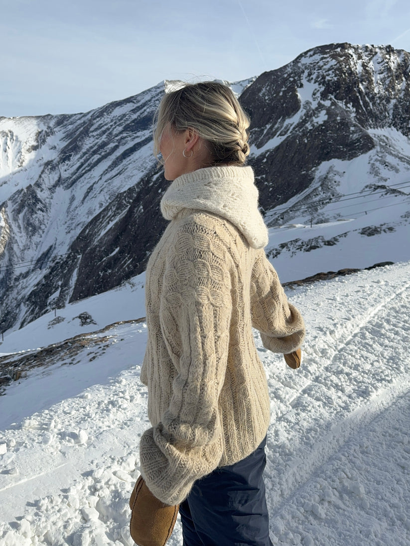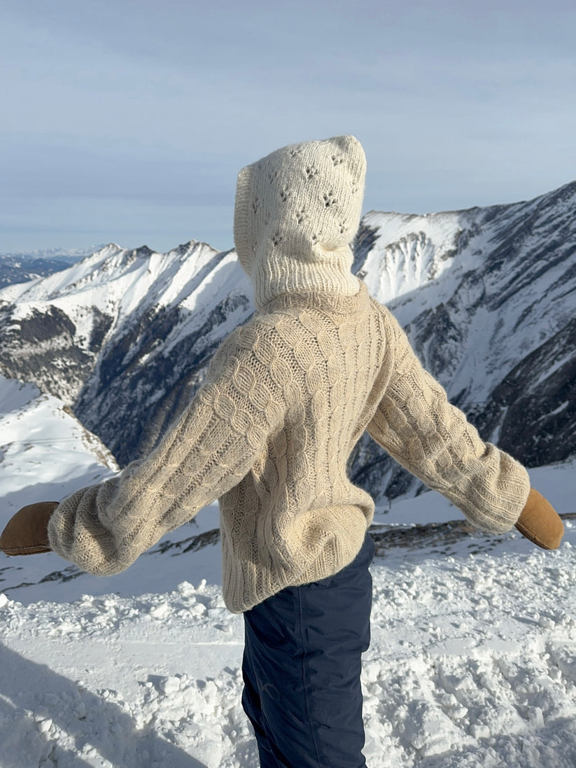 The Milotté Headover is a quick-knit chunky balaclava with a cute lace pattern. The ribbing is worked in the round on circular needles, while the rest of the balaclava is knitted back and forth in stockinette stitch. At the top, the pieces are grafted together, ideally using Kitchener stitch for an invisible finish. You then pick up stitches around the face opening to knit a ribbed edge. Using the Italian bind-off creates a beautiful and elastic edge along the face opening.